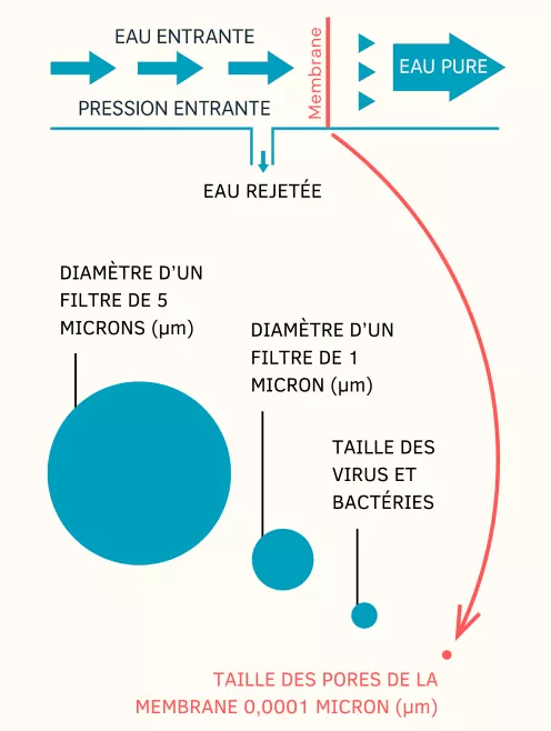 C’est uniquement sous l’effet d’une pression suffisante (généralement assurée par la pression du réseau domestique) que les molécules d’eau sont forcées à traverser cette barrière, tandis que la quasi-totalité des autres substances – même de taille nanométrique – sont retenues puis évacuées via le circuit de rejet.