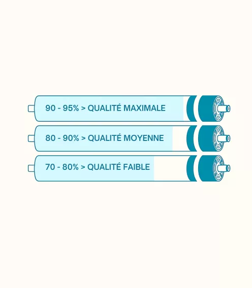 Elle est évaluée par le taux de rejet des sels minéraux dissous (TDS). Lorsque ce taux passe sous le seuil de 70 %, le filtre a perdu en efficacité et doit être remplacé. Pour le calculer avec votre stylo TDS, voici la formule à appliquer :