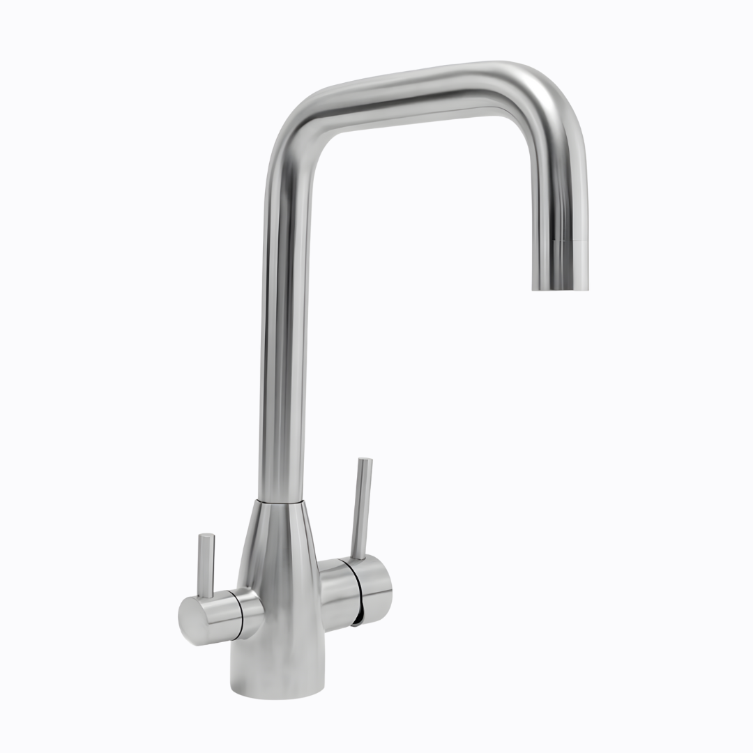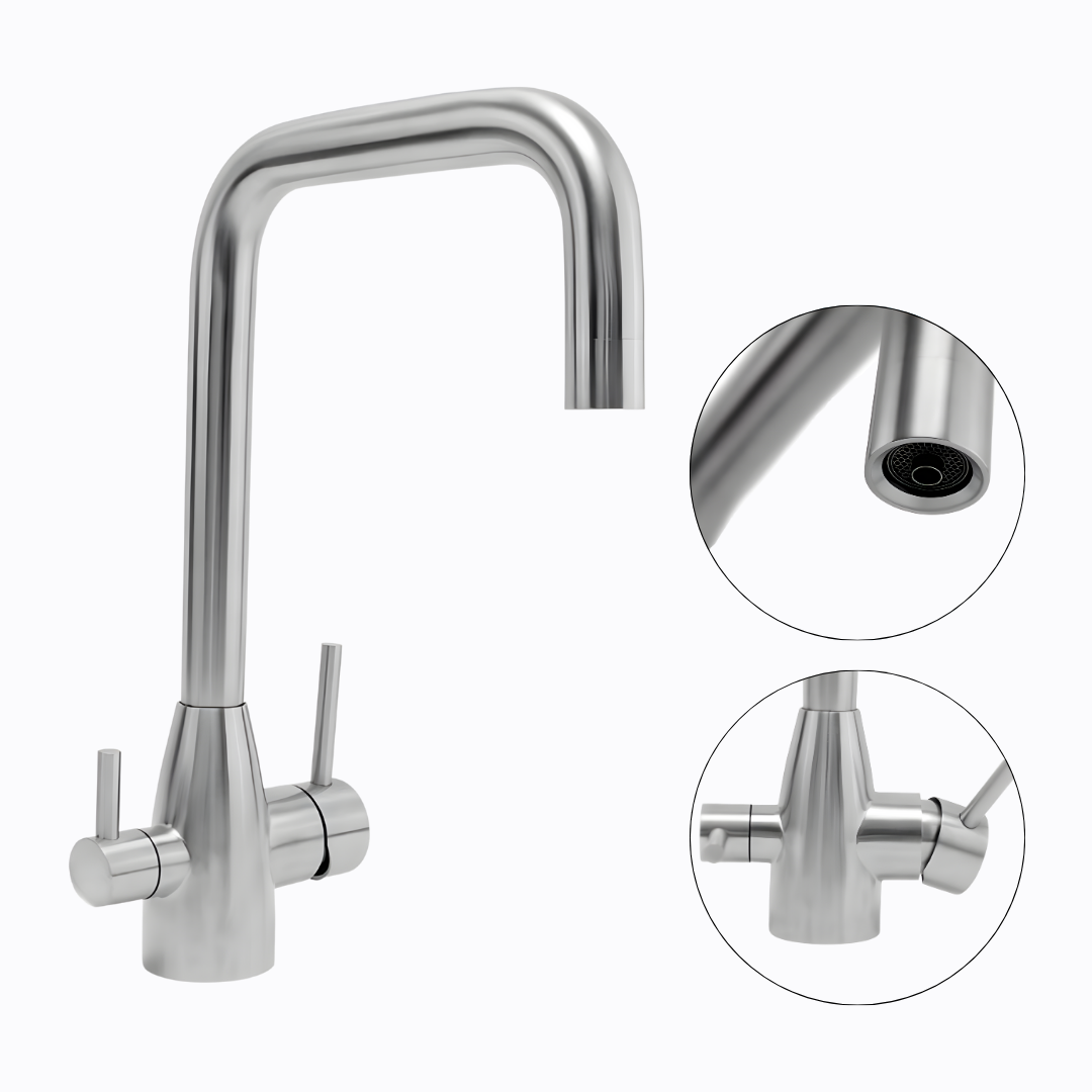 Un robinet 3 voies, qui regroupe eau chaude, eau froide et eau filtrée dans un seul mitigeur.